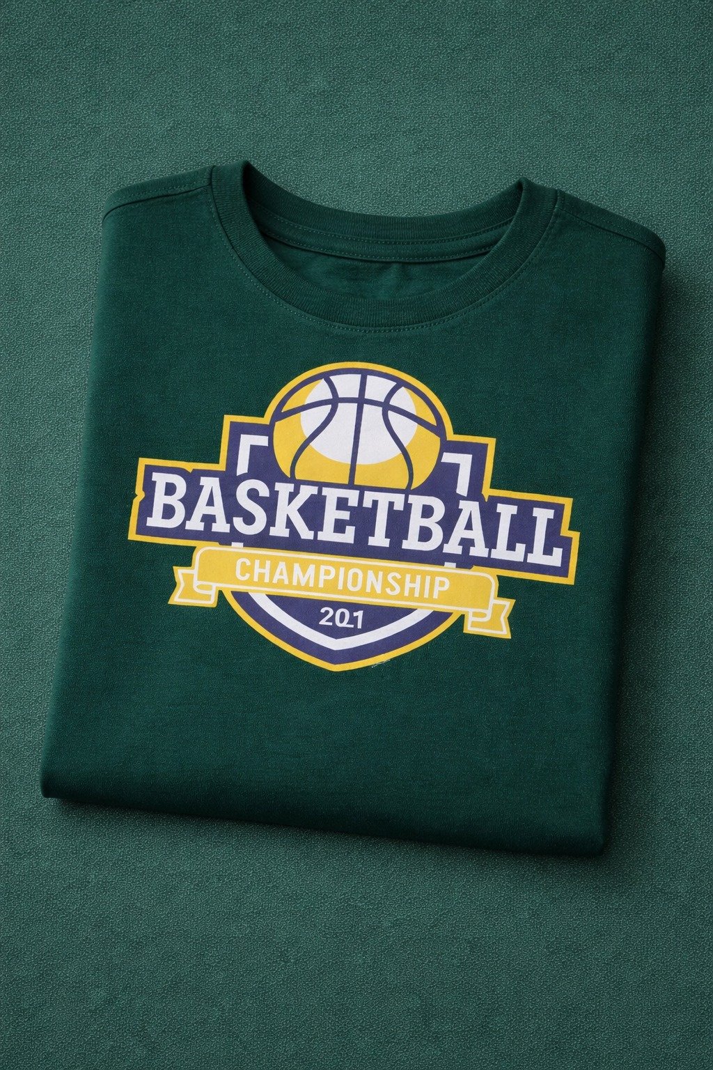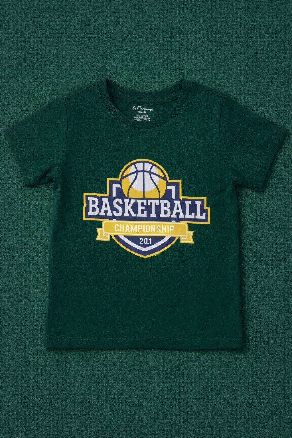 This boys dark green graphic t-shirt features a sporty “Basketball Championship” print that is perfect for young sports enthusiasts. Made from soft and breathable cotton fabric, the t-shirt offers comfort and flexibility for everyday activities. In this product image, the young boy model is wearing the t-shirt with denim shorts, creating a casual sporty look suitable for playtime, school, or outdoor activities. The basketball-themed design and rich green color give the shirt a bold athletic style while the professional lighting highlights the fabric quality and print details.