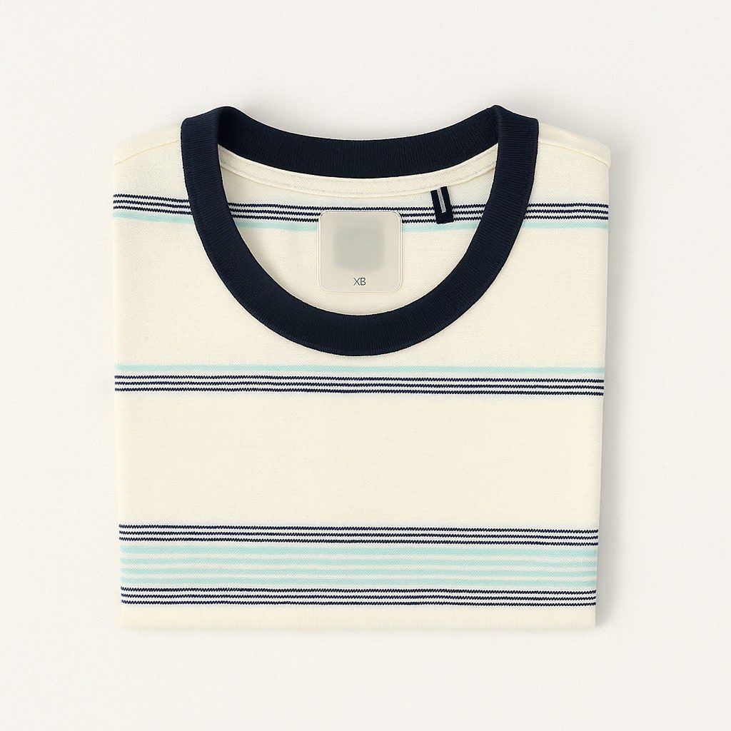 This export-quality cream crewneck T-shirt brings timeless style with a modern twist. Featuring elegant navy, teal, and aqua horizontal stripes across soft cream fabric, the shirt is crafted from high-grade breathable cotton. Its clean design and refined ribbed neckline offer both sophistication and everyday comfort. Perfect for casual wear, office layering, or travel, this premium tee is a staple recognized and used by globally acclaimed apparel brands.