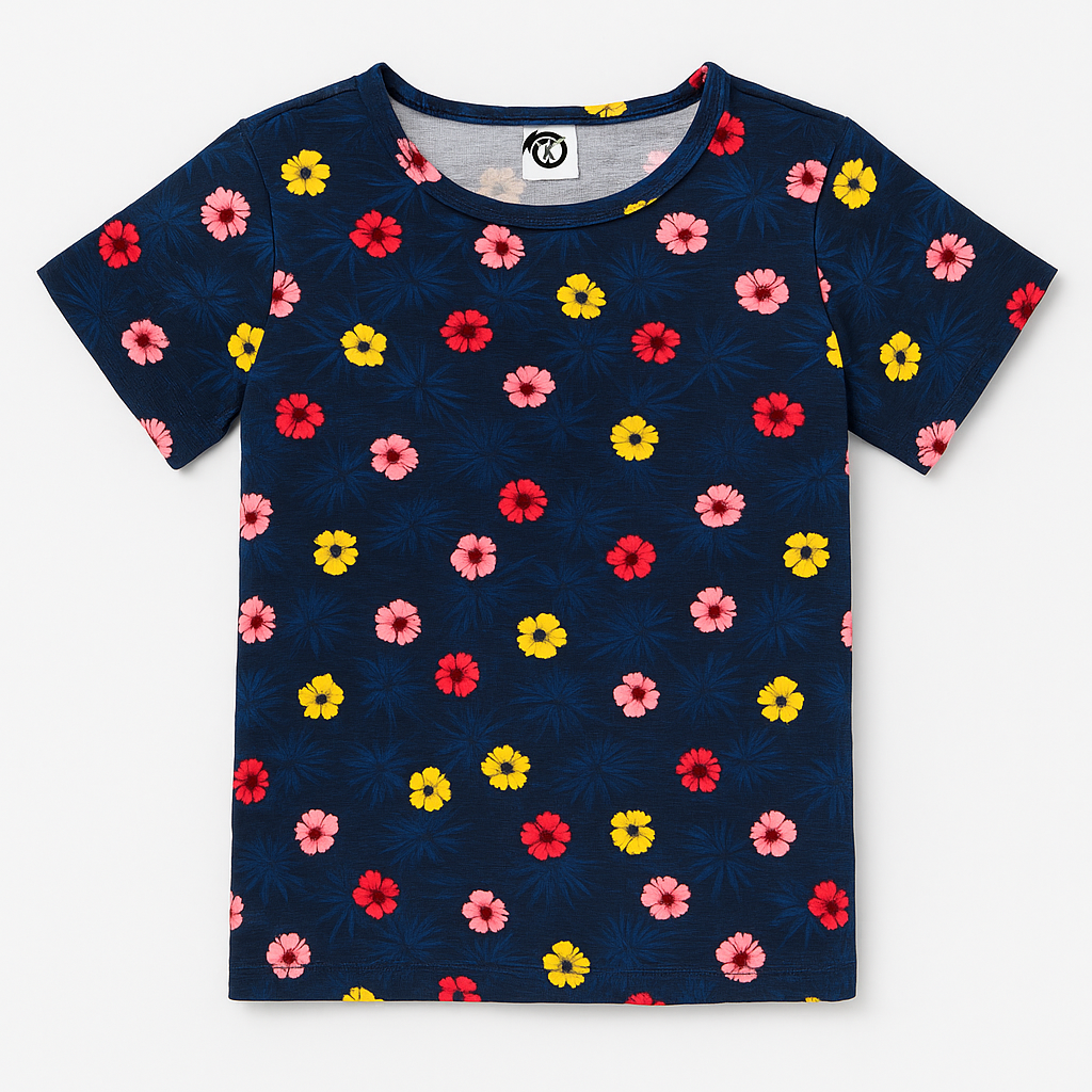 This navy blue girls’ t-shirt features an all-over floral print in bright red, yellow, and soft pink hues. Made from soft, breathable cotton, it offers ultimate comfort while showcasing a cheerful and playful style. Perfect for both casual wear and weekend fun, this floral tee can be paired effortlessly with jeans, skirts, or shorts. A must-have summer essential for stylish little ones.