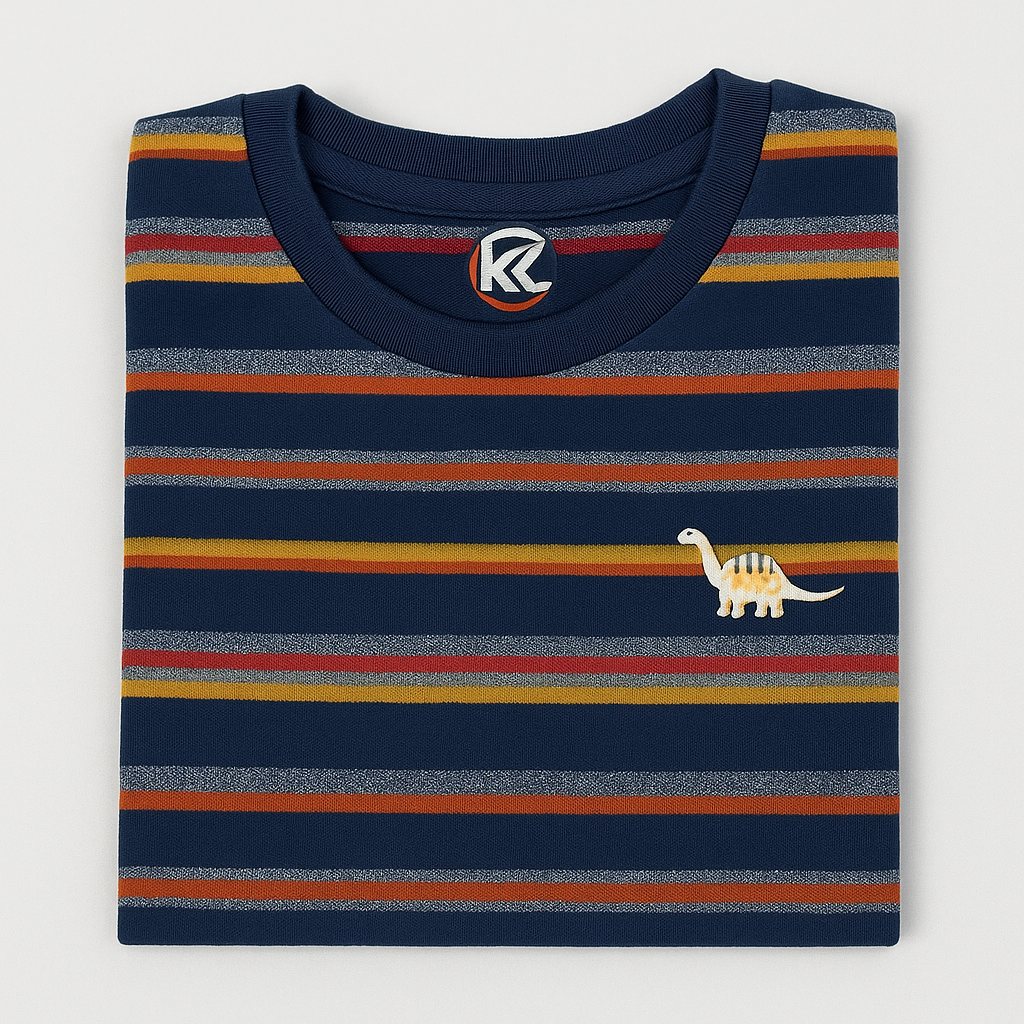 This kids’ navy blue t-shirt features vibrant horizontal stripes in orange, mustard, grey, and red shades, made from soft breathable fabric for all-day comfort. The cute embroidered dinosaur on the chest adds a fun and playful touch, making it perfect for everyday wear or casual outings. Easy to pair with jeans or shorts, this tee is both stylish and comfortable.